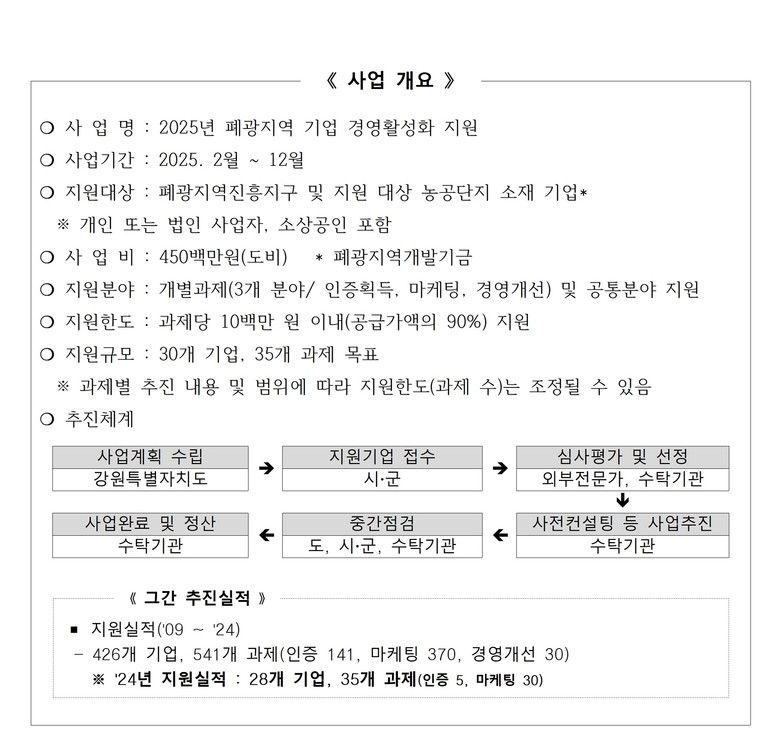 도와 폐광지역 4개 시군(태백, 삼척, 영월, 정선), 강원특별자치도경제진흥원이 함께하는 『폐광지역 기업 경영활성 지원사업』은 각 시군 정량 평가 및 추천, 현지 실사, 종합 평가 순으로 참여 기업을 선정하고, 4월부터 추진하여 올해 말까지 최종 사업을 마무리할 예정이다.