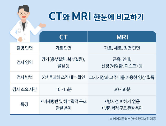 에이치플러스 양지병원 영상의학과 유은혜 과장은 “CT와 MRI는 다양한 질병을 검사하고 진단하기 위한 효과적인 방법이지만 질병 부위나 질환의 특성에 따라 차이점이 존재한다”라고 말했다. X-ray 검사에서 이상 소견이 보였을 때 추가로 진행하는 CT 검사는 10~15분 정도로 1시간 이상 시간이 소요되는 MRI에 비해 검사 시간이 짧다.
