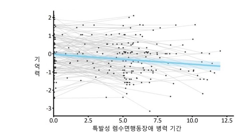 | ▲특발성 렘수면행동장애 병력 기간에 따른 인지기능(기억력)의 변화. 시간이 지남에 따라 인지기능(기억력) 점수가 지속 저하되고 있음을 보여준다.(사진=분당서울대병원) |
