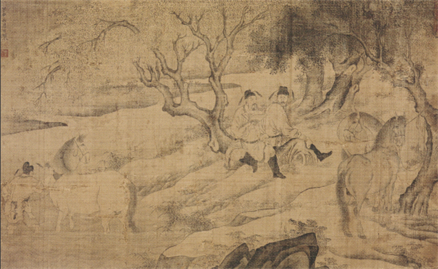 말을 매어두고 나무 밑에서 휴식을 취하는 두 명의 관리와 강에서 말을 목욕시키는 마부를 소재로 한 그림은 현전하는 공재의 말 그림 중 규모가 가장 크다.