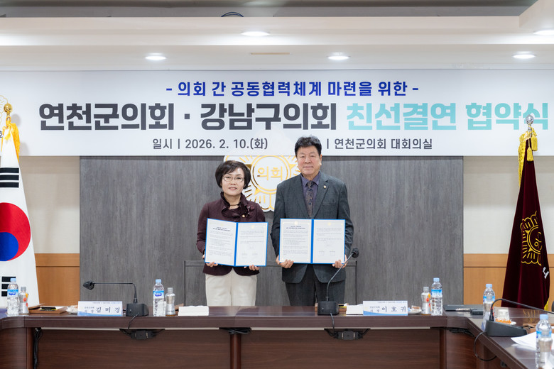 | ▲ 10일 친선결연 협약을 체결중인 강남구의회 이호귀 의장과 연천군의회 김미경 의장 |