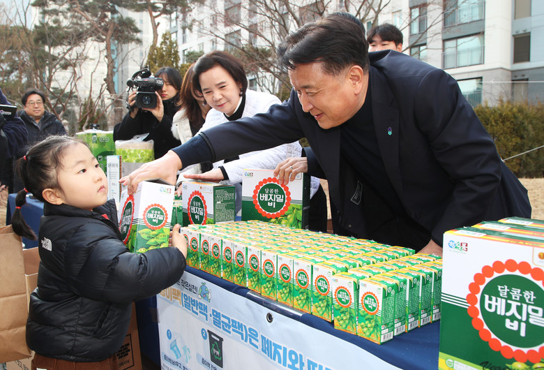 오늘 캠페인에는 김영환 지사가 깜짝 방문하여 주민이 가져온 종이팩을 베지밀과 직접 교환해 주는 행사에 참여하며 폐자원의 중요성을 강조하는 뜻깊은 시간을 가졌다.