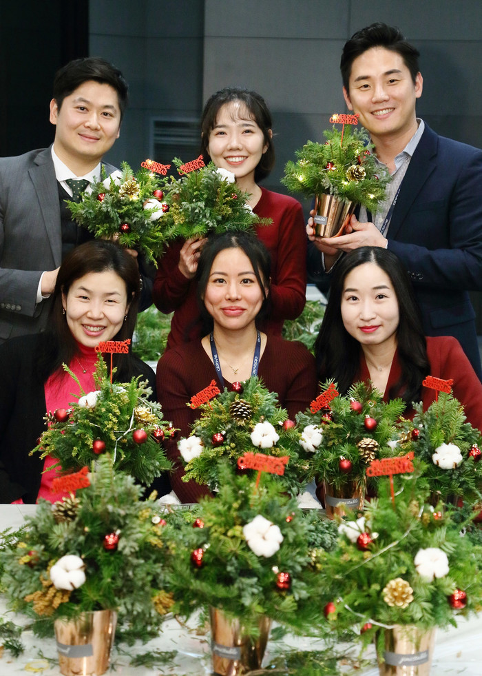 실제 전나무와 소나무 등의 가지로 미니 트리를 세우고, 크리스마스 분위기의 오너먼트와 전구 등을 장식하는 순서로 진행됐다. 직원들은 담소를 나누며 각자의 개성과 솜씨를 발휘한 생화트리를 완성했으며, 다 만든 트리는 기프트 박스에 담아 소중한 가족에게 선물할 수 있도록 준비했다.