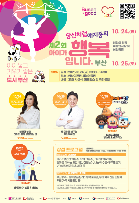 ◈ ▲오은영 박사 등 전문가 강연 ▲브레드 이발소(싱어롱쇼) ▲각종 체험 프로그램 ▲'정책 공감존' 등 다채롭게 구성 [부산 세계타임즈=이용우 기자] 부산시(시장 박형준)는 내일(24일)과 25일 양일간 영화의전당 하늘연극장 및 야외광장에서 저출생 대응 캠페인 당신처럼 애지중지 '제2회 아이가 행복입니다. 부산'을 개최한다고 밝혔다.