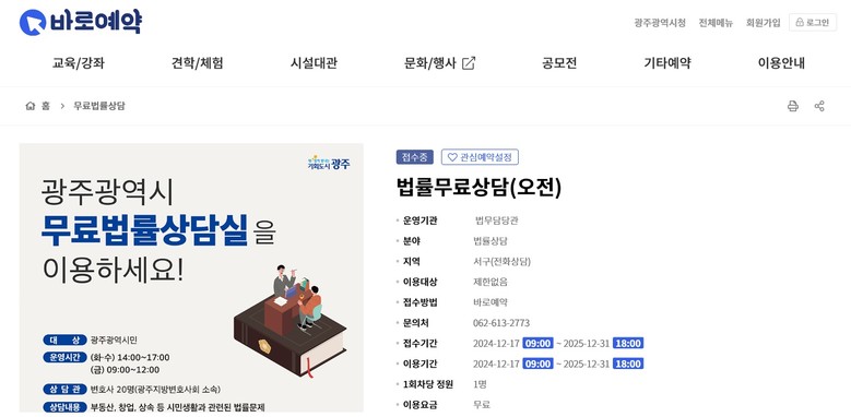 [광주 세계타임즈=손권일 기자] 광주광역시(시장 강기정)가 시민 편의를 위해 무료법률상담 온라인 예약시스템을 도입했다.