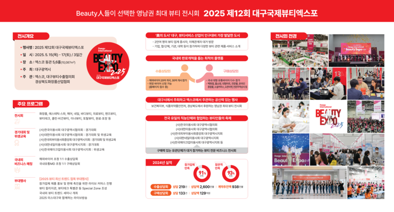 김정기 대구광역시장 권한대행 행정부시장은 “지역 뷰티 산업의 경쟁력을 강화하기 위한 이번 박람회가 기업과 소비자 그리고 뷰티서비스업이 함께 상생하는 플랫폼으로 자리잡기를 기대한다”고 말했다.
