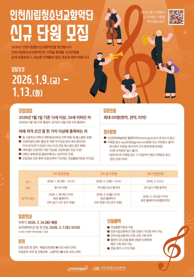모집과 관련된 세부 내용은 인천광역시 누리집 내 고시공고 또는 인천문화예술회관 누리집 내 새소식 게시판을 통해 확인 가능하다. ▲전형일정 및 절차는 예술단운영팀(032-420-2742), ▲모집분야 직무 및 전형 과목 은 인천시립교향악단(032-420-2781)으로 문의 할 수 있다.