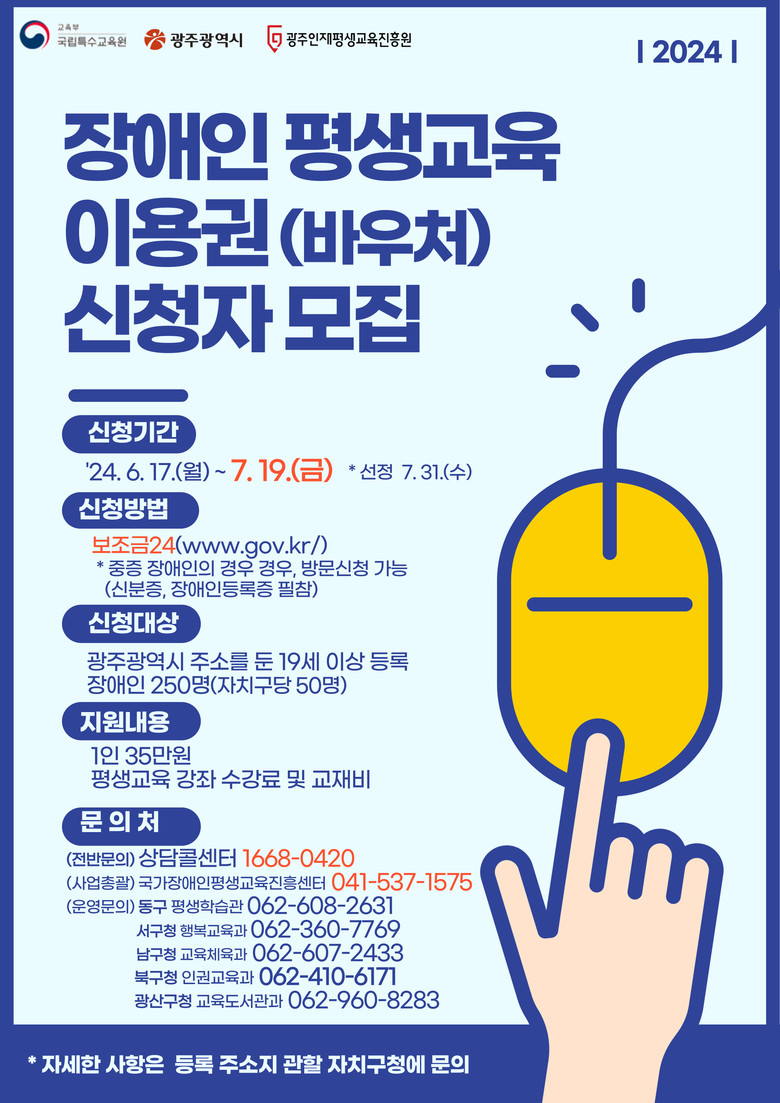 바우처 운영과 관련된 문의는 장애인 평생교육 이용권 상담콜센터(1668-0420) 또는 자치구 대표번호(동구 608-2631, 서구 360-7769, 남구 607-2433, 북구 410-6171, 광산구 960-8283)로 문의하면 된다.
