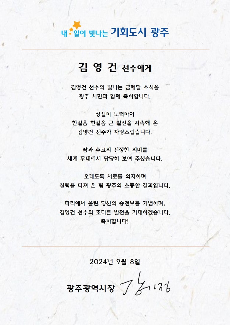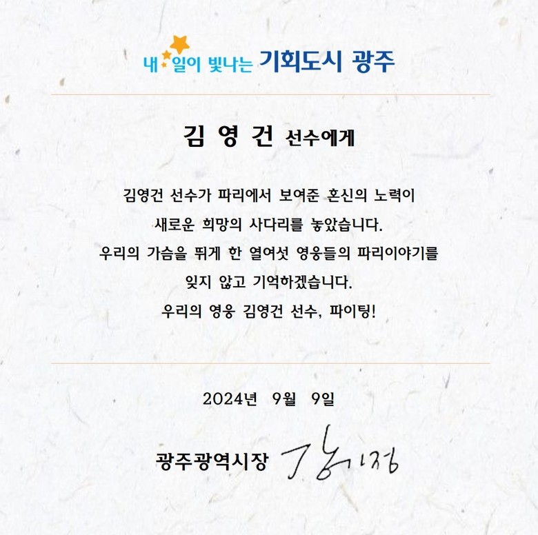 강기정 시장은 이날 광주시 소속 선수단에 축하 메시지를 보내 “파리에서 보여준 혼신의 노력이 새로운 희망의 사다리를 놓았다”며 “우리의 가슴을 뛰게 한 열여섯 영웅들의 파리이야기를 잊지 않고 기억하겠다”고 응원했다.