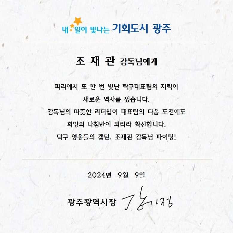 강 시장은 “파리에서 또 한 번 빛난 대표팀의 저력이 새로운 역사를 썼다”며 “따뜻한 리더십이 대표팀의 다음 도전에도 희망의 나침반이 되리라 확신한다”고 격려했다.