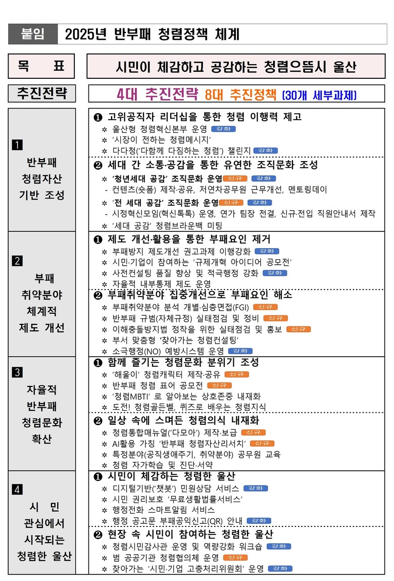 한편, 울산시는 이날 김두겸 시장 주재로 2025년 반부패 청렴정책 추진계획(4대 전략 30개 세부과제) 보고회를 갖고 울산시 고위공무원(실국장 이상)과 추진계획을 공유하고 청렴도 향상을 위한 방안을 모색하는 등 ‘청렴으뜸시’ 실현을 위해 적극적 노력한다는 계획이다.