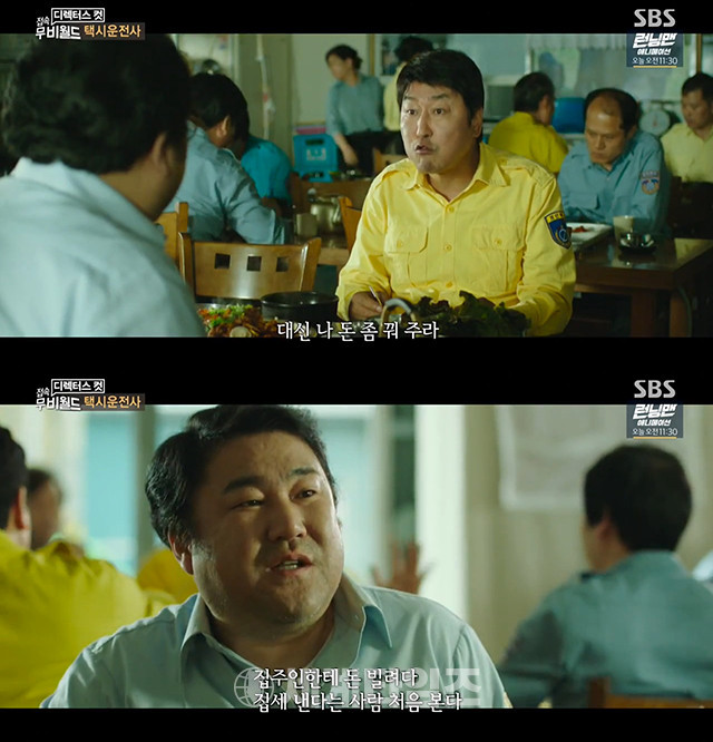 지난달 29일 방송된 SBS '접속무비월드'에서는 영화 '택시운전사'의 삼거리 기사식당에서 맛있게 식사 중인 송강호가 친구이자 집주인인 고창석에게 10만 원을 빌려서 집세를 내려는 장면이 공개됐다.