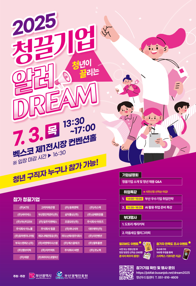 한편, 오늘(3일) 오후 1시 30분 벡스코 컨벤션홀 2층에서는 부산의 우수기업 소개와 함께 맞춤형 채용정보 제공을 위한 '청끌기업 알려드림(DREAM)'이 함께 열린다.