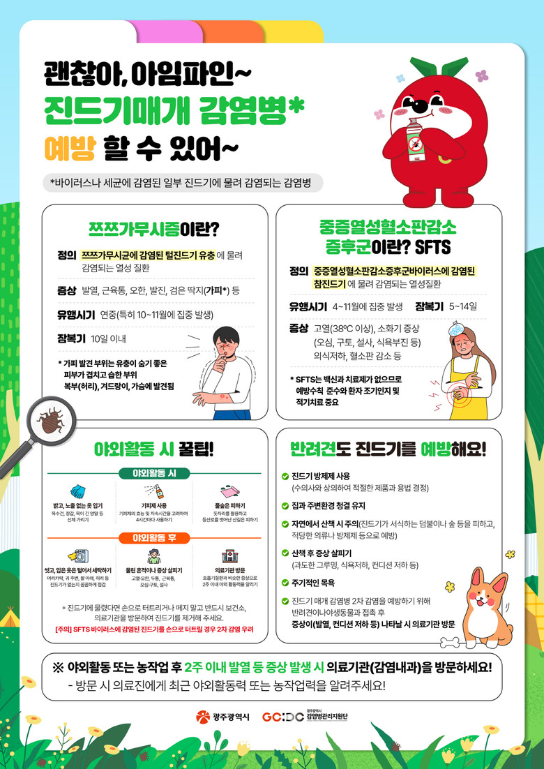 배강숙 공공보건의료과장은 “진드기 매개 감염병 예방을 위한 가장 효과적인 방법은 진드기에 물리지 않는 것”이라며 “벌초·성묘 등 야외활동이 증가하는 가을철에는 야외활동 예방수칙을 준수해 주길 바란다”고 당부했다.