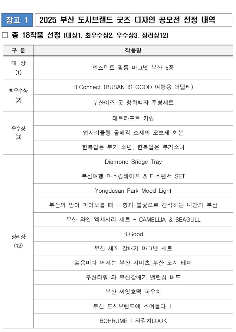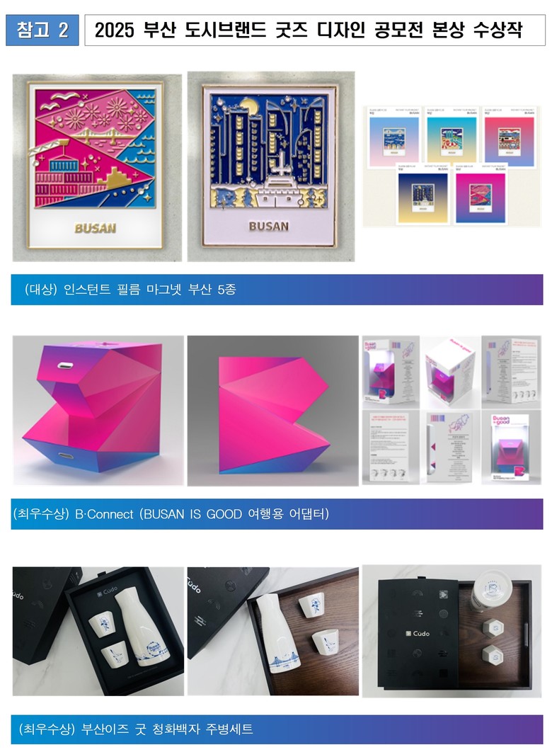 한편, 공모전에 대한 기타 자세한 내용은 「2025 부산 도시브랜드 굿즈 디자인 공모전」 공식 누리집(http://busangoods.kr/)에서 확인할 수 있다.