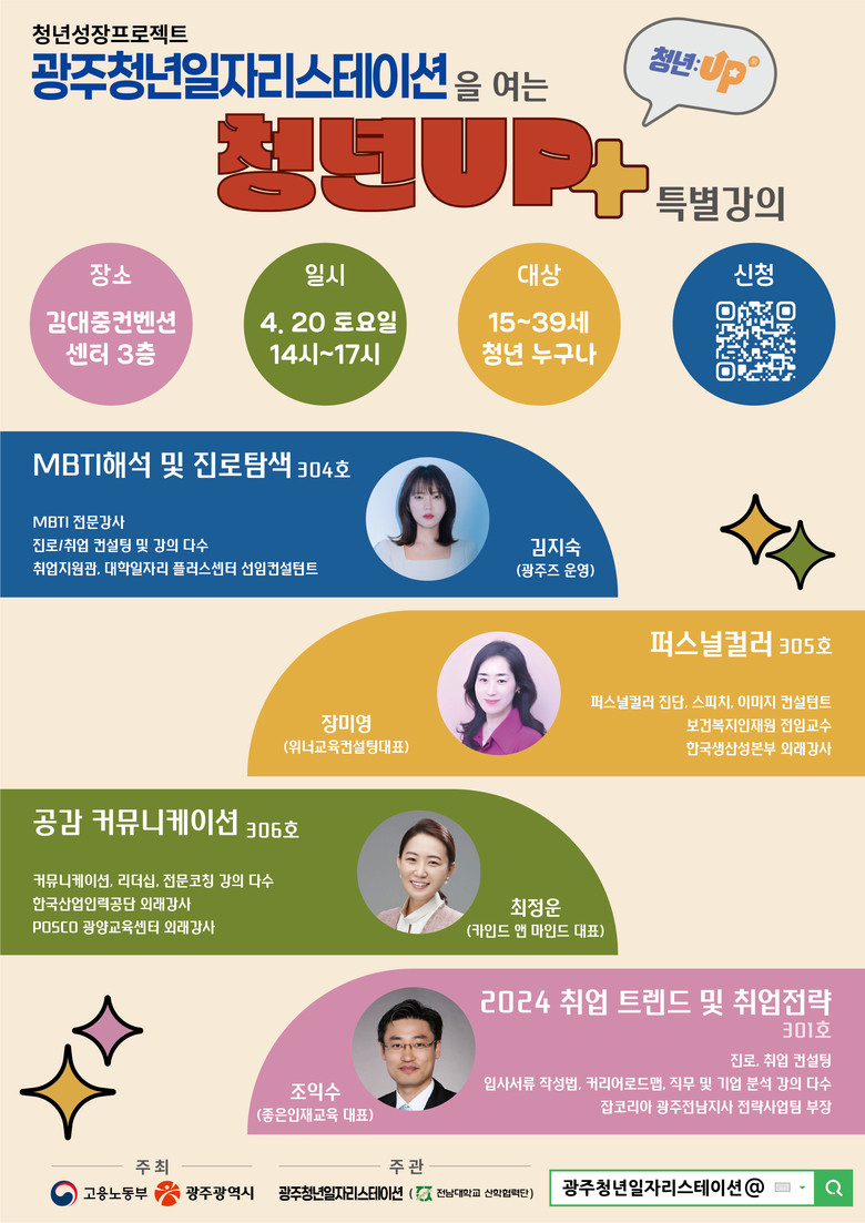 ‘청년UP+’ 특강은 15세부터 39세 청년 총 160여명(강의당 40명)을 대상으로, ▲MBTI 분석과 진로 탐색 ▲맞춤 색상(퍼스널 컬러) 진단과 이미지 상담(컨설팅) ▲올해 채용 경향과 취업 준비 전략 ▲공감 의사소통 등을 설명한다.