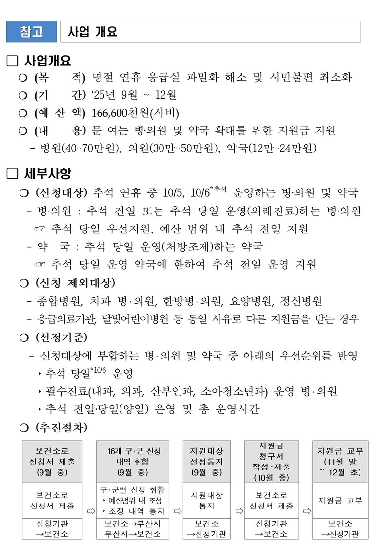 이번 사업은 추석 연휴 기간 중 10월 5일과 6일에 문을 여는 병의원과 약국을 운영해, ▲경증환자는 가까운 의료기관을 이용하고 ▲응급실은 중증환자 중심으로 운영될 수 있도록 지원하는 것을 목표로 한다.