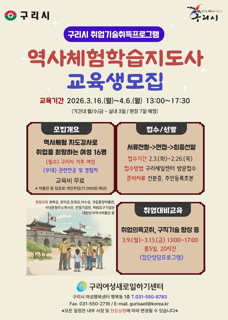 교육은 3월 16일부터 4월 6일까지 매주 월·수·금요일에 진행되며, 이론 교육 3일과 현장 실습 7일로 구성된다. 현장 실습은 경복궁, 창덕궁, 창경궁, 덕수궁을 비롯해 국립중앙박물관, 서대문형무소 역사관, 전쟁기념관, 백범김구기념관, 대한민국역사박물관 등 주요 역사·문화 현장에서 이루어질 예정이다. 모집 기간은 2월 3일부터 2월 26일까지다.