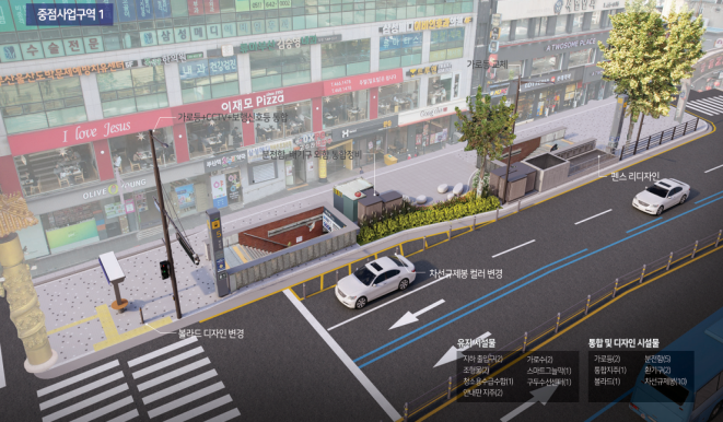 공공시설물 560개 중 도시철도 진출입구 및 환풍구, 분전함 등 철거와 이동이 불가능한 도시기반시설물 179개를 제외한 381개 시설물에 대해 유관기관과 수차례에 걸쳐 협의를 진행해 ▲택시 승강장·현수막 게시대·볼라드* 등 103개의 철거시설물 ▲폐쇄 회로 텔레비전(CCTV)·가로등·신호등·안내사인 지주 등 47개의 시설물 통합과 ▲리디자인 등 162개의 정비 대상 시설물을 끌어냈다.