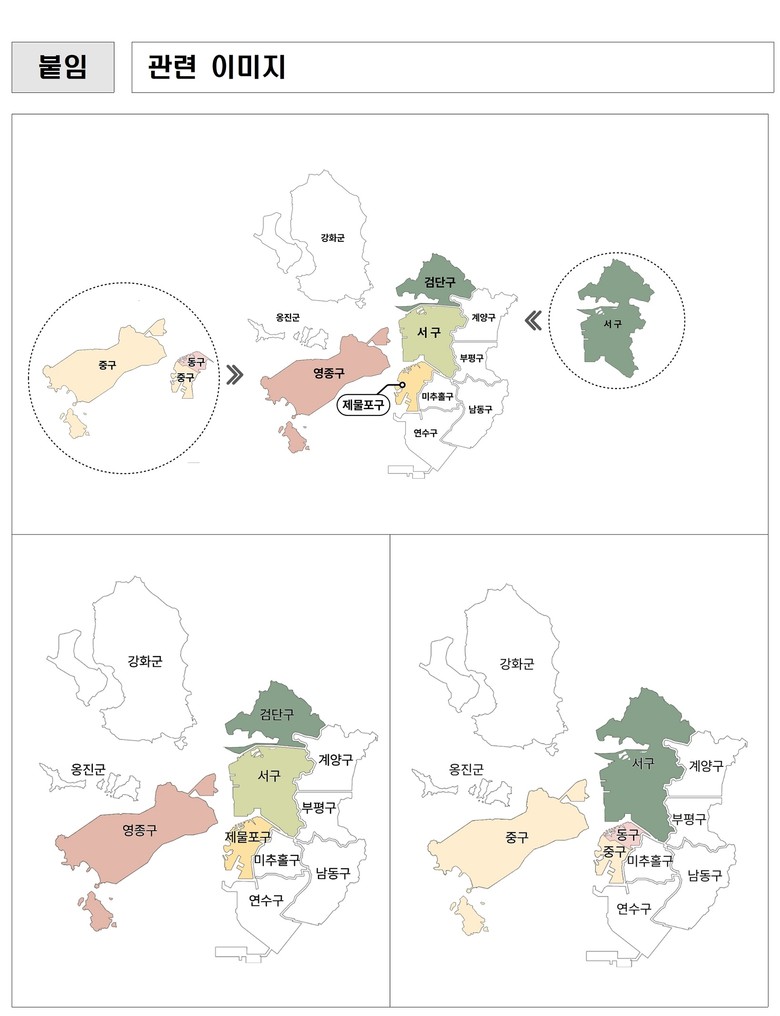 인천형 행정체제 개편은 현재의 중구와 동구를 ‘제물포구’와 ‘영종구’로 통합·조정하고, 서구에서 ‘검단구’를 분리하는 것으로, 인천의 행정체제를 기존 2군·8구에서 2군·9구로 확대하는 사업이다.