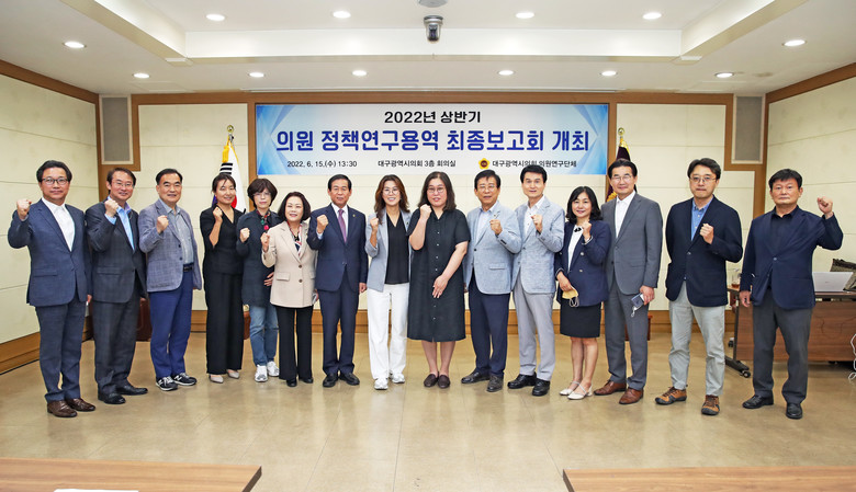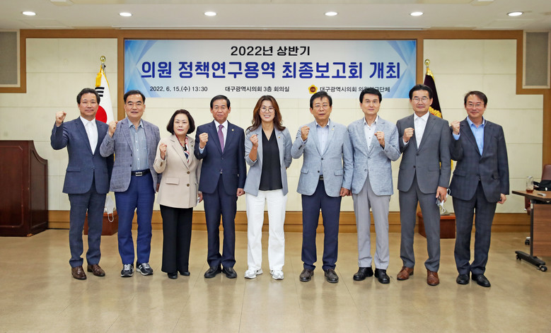 [세계타임즈=대구 한성국 기자] 대구시의회 4개 의원연구단체가 공동으로 주관한 의원 정책연구용역 최종 보고회가 6월 15일(수) 시의회 3층 회의실에서 열렸다. 의원연구단체 소속 시의원들은 그간의 연구 성과를 보고 받고, 제8대 의회 의원 정책연구 활동을 최종 마무리했다.