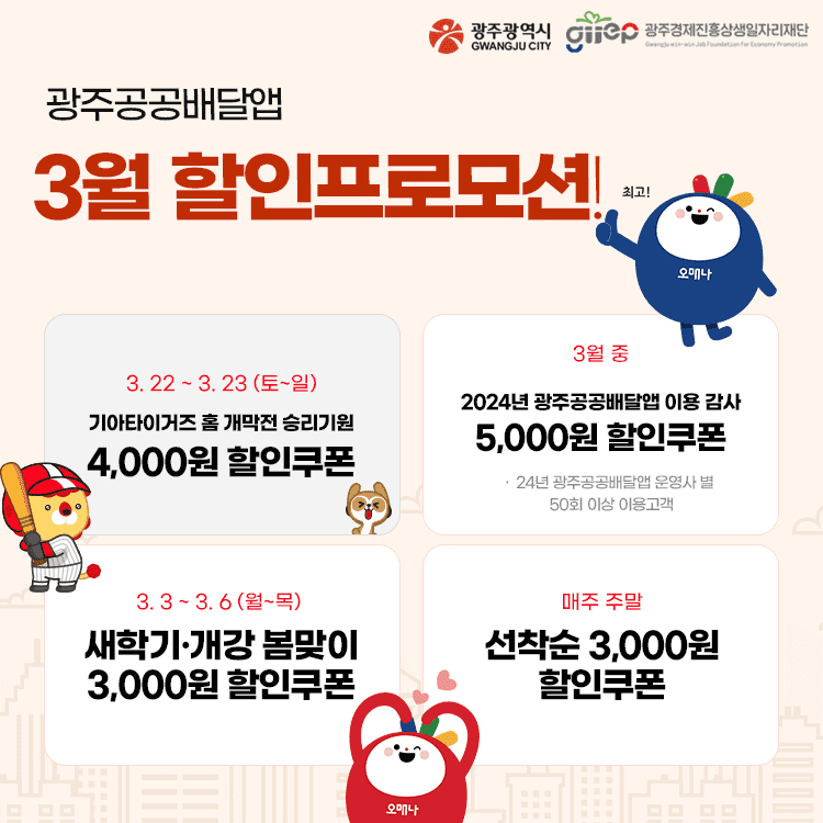 3월 특별할인 프로모션은 광주공공배달앱을 이용하고 있는 광주시민이면 누구나 참여할 수 있다. 공공배달앱 운영사인 ‘위메프오’와 ‘땡겨요’를 통해 할인쿠폰을 내려받을 수 있다.