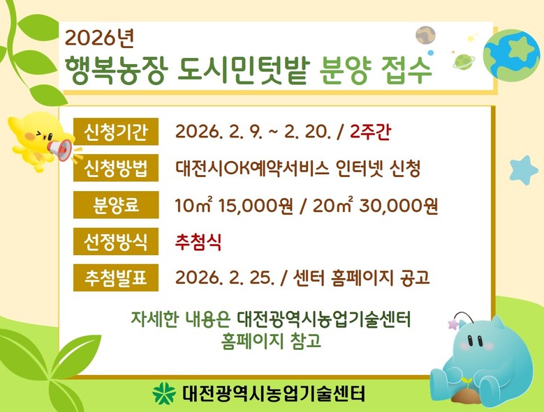 [대전 세계타임즈=이채봉 기자] 대전시농업기술센터는 도심속 농업.농촌 체험을 통한 도시농업 확산을 위해 2월 9일부터 대전시민을 대상으로 행복농장(도시민텃밭) 참가자 110세대를 모집한다.