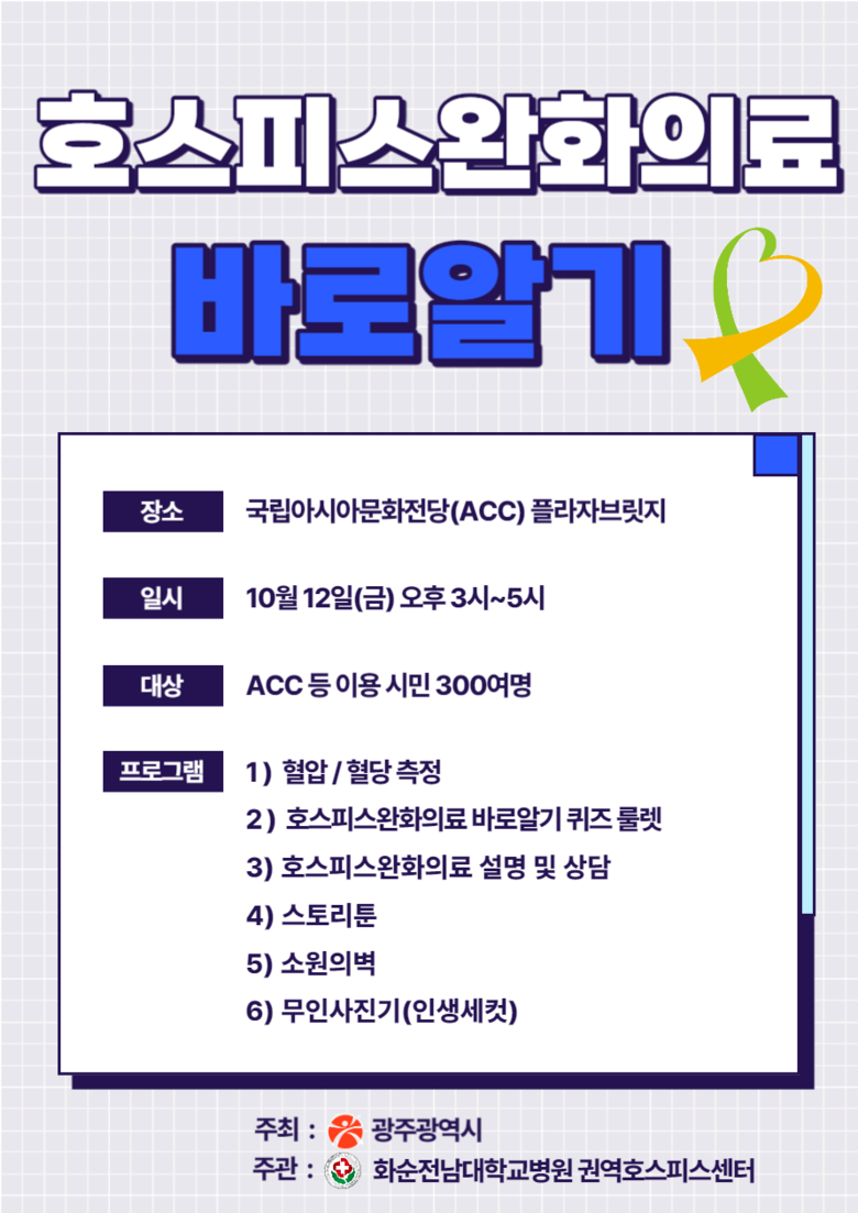 이번 캠페인은 제11회 호스피스의 날(10월 둘째주 토요일)을 기념해 광주시와 화순전남대학교병원 권역호스피스센터, 3개구 보건소(동구·서구·남구), 광주·전남호스피스전문기관, 제주호스피스전문기관(6권역) 등 7개 기관이 합동으로 진행한다.