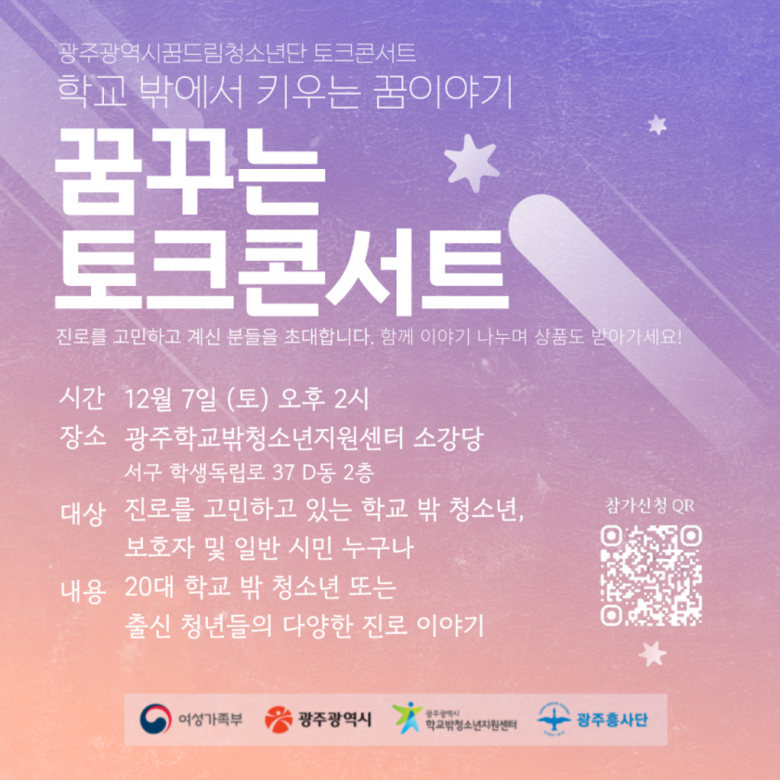 김호연 광주시 꿈드림청소년단 대표는 “토크콘서트를 준비하면서 진로에 대해 이야기를 하다 보니, 꿈은 목표가 아니라 과정이라 느꼈다”며 “특별한 개성을 가진 6명의 학교 밖 청소년과 성장 청년들의 다채로운 이야기를 준비했으니 많은 분들이 들어주길 바란다”고 말했다.