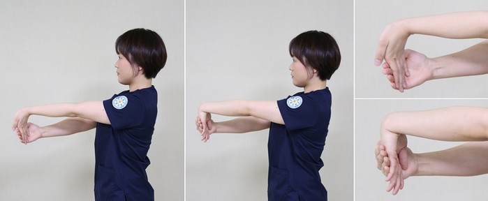 | ▲손목 스트레칭 (바른세상병원 제공)=양팔을 앞으로 쭉 펴고 스트레칭 할 손을 반대쪽 손으로 잡고 당겨준다. 이때 팔꿈치는 쭉 펴고 한 번은 손바닥 쪽, 한 번은 손등 쪽을 잡고 당긴다.