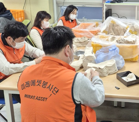 이번 직업재활 포장 봉사에 참여한 미래에셋생명 임직원 봉사자들은 성인 발달장애인에게 직업훈련 및 고용의 기회를 제공하여 사회적, 경제적으로 독립할 수 있도록 지원하는 관내 보호작업장에서 일손을 거들며 양말 포장 작업을 함께 진행했다.