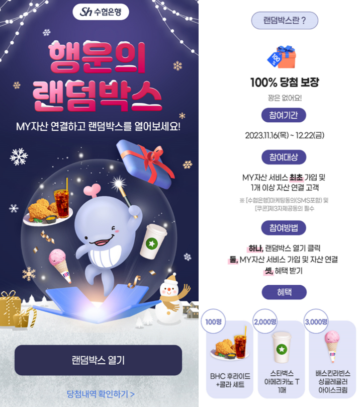 수협은행은 이번 이벤트를 통해 오는 12월 22일까지 MY자산 서비스에 신규 가입하고 1개 이상 자산을 연결한 고객 5,100명에게 BHC치킨세트(100명), 스타벅스 커피(2,000명), 배스킨라빈스 아이스크림(3,000명) 등 푸짐한 모바일 경품 쿠폰을 증정한다.