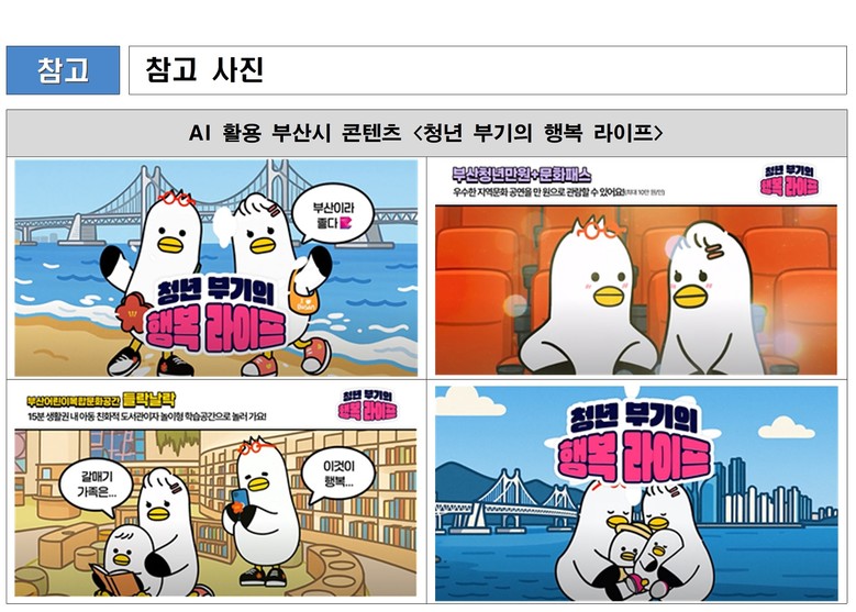 ◈ 시, 인공 지능을 활용한 다양한 콘텐츠로 시민이 공감하는 홍보 이어갈 예정 [부산 세계타임즈=이용우 기자] 부산시(시장 박형준)는 청년 정책을 스토리텔링 형식으로 담아낸 인공 지능 애니메이션 「청년 부기의 행복 라이프」를 어제(9일) 공개했다고 밝혔다.