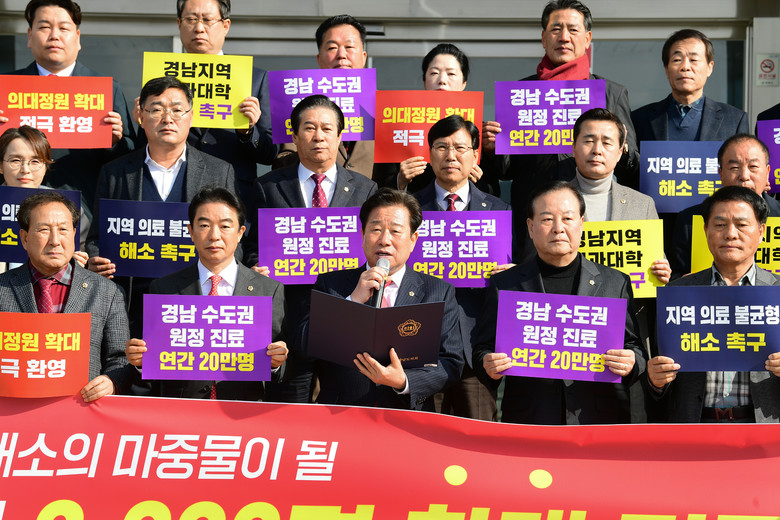 [경남 세계타임즈=최성룡 기자] 경상남도의회 김진부 의장을 비롯한 의원 일동은 2월 8일 도의회 현관 앞에서 지난 6일 보건복지부의 ‘2025학년도 의과대학 정원 2,000명 확대’ 발표와 관련해 적극 환영의 뜻을 전하고 의대 정원 확대만으로는 해소할 수 없는 지역 내 의료인력 불균형 문제 해결을 위해 조속히 경남지역 내 의과대학을 신설해 줄 것을 정부에 촉구하는 성명서를 발표하였다.