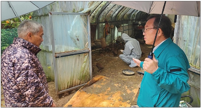 | ▲ 울산보건환경연구원 심민령 원장이 조류인플루엔자 발생 예방을 위해 토종닭 농가를 직접 방문해 방역 실태를 점검하고 있다. |