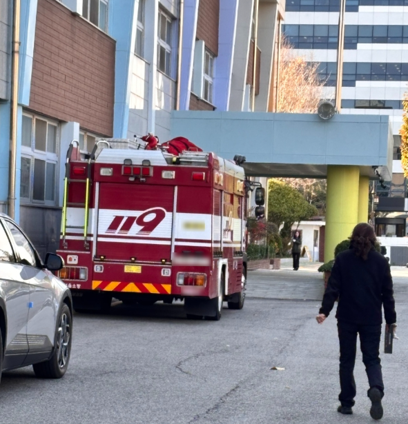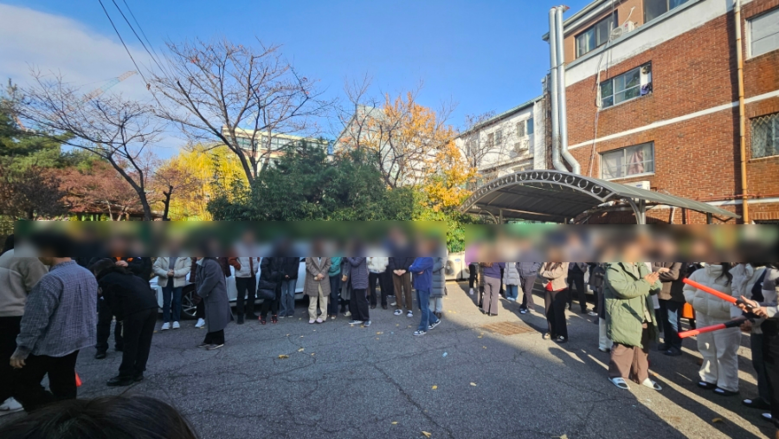 이번 훈련은 1층에서 화재가 발생한 상황을 설정해 신고, 경보 발령, 대피, 초기 대응 절차를 간단히 수행하고, 이어 소방서가 화재 시 행동요령과 소화기 사용법 등을 짧게 교육하는 방식으로 진행됐다.