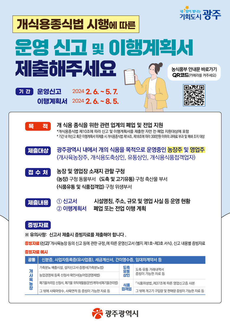 이에 따라 기존 개 식용 관련 사업장을 운영 중인 사업자는 오는 5월 7일까지 운영신고서를 영업장 소재지 자치구로 직접 제출해야 한다. 신고한 업체들은 오는 8월 5일까지 영업장 감축 계획, 전업, 폐업 일정이 담긴 이행계획서를 제출해야 한다.
