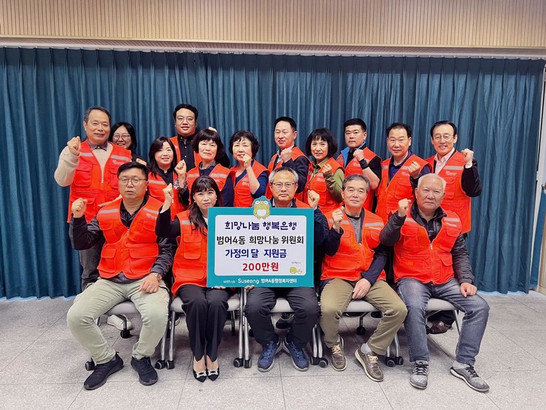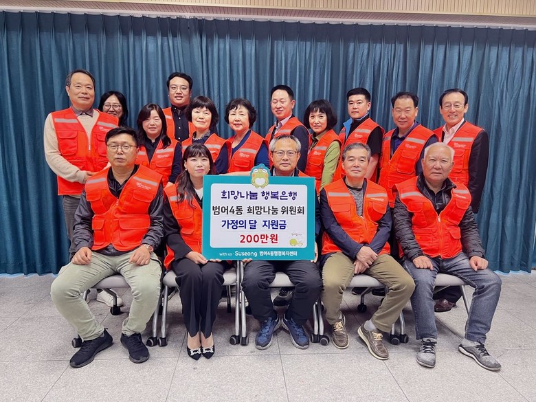 [수성구 세계타임즈=한윤석 기자] 대구시 수성구 범어4동 희망나눔위원회(위원장 안삼문)는 가정의 달을 맞아 지난 2일, 관내 저소득층 10세대에 성금 200만 원을 전달했다.