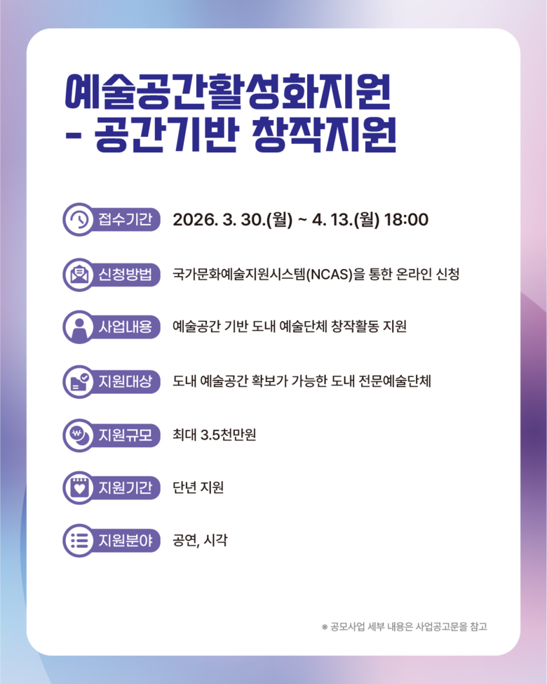 공모 접수는 오는 30일(월)부터 국가문화예술지원시스템(NCAS)을 통해 가능하며, 마감은 4월 13일(월) 오후 6시까지이다.