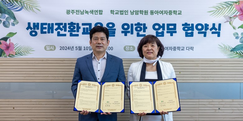 [광주 세계타임즈=손권일 기자] 동아여자중학교가 학교 환경교육 및 사회 환경교육의 활성화를 위해 광주전남녹색연합(상임대표 김영선)과 생태전환교육을 위한 업무 협약을 10일 체결했다고 밝혔다.