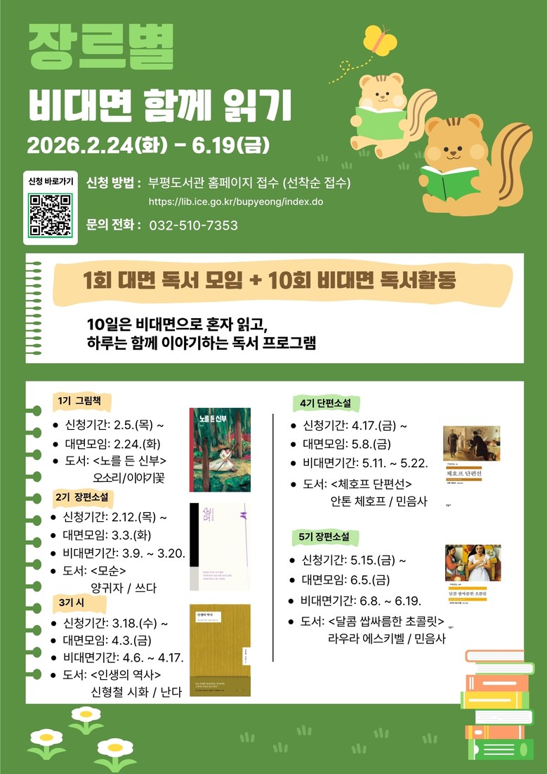 1기 모집은 2월 5일부터 부평도서관 누리집에서 선착순으로 진행되며, 이후 기수 모집 일정 및 기타 자세한 사항은 도서관 누리집을 확인하거나 독서문화과(☎ 032-510-7353)로 문의하면 된다.