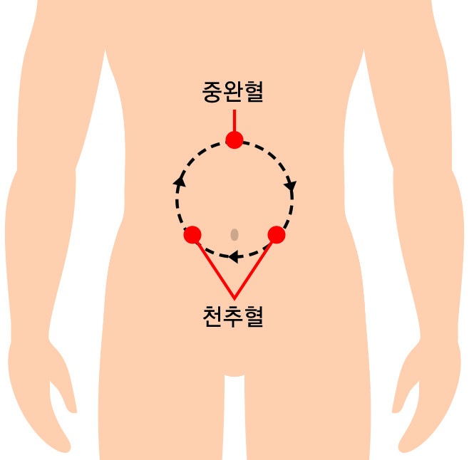 - 천추(ST25, 배꼽 양옆으로 약 3cm정도 떨어진 부위)