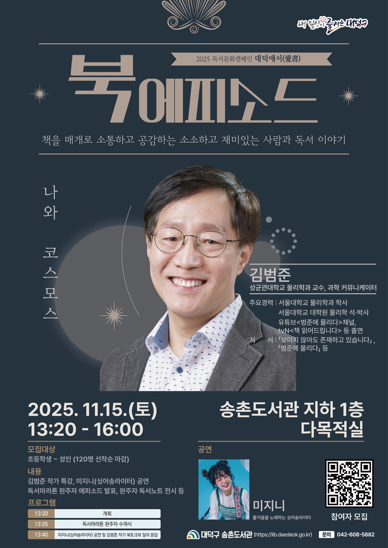 메인 강연은 성균관대 물리학과 김범준 교수가 맡는다. 저서 ‘보이지 않아도 존재하고 있습니다’, ‘범준에 물리다’를 바탕으로 ‘나와 코스모스’를 주제로 우주 속 인간 존재의 의미를 쉽게 풀어내며, 과학적 통찰을 통해 독서의 지평을 넓히는 시간을 선사한다.