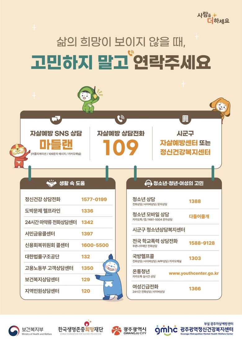 [광주 세계타임즈=손권일 기자] 광주광역시(시장 강기정)는 정신건강 위기 상황에 놓인 시민이 언제든 도움받을 수 있도록 다양한 지원체계와 맞춤형 서비스를 마련해 적극 추진하고 있다.