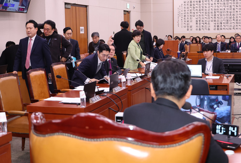12일 국회 법제사법위원회 전체회의에서 여당 의원들이 '명태균 특검법' 상정안 표결이 시작되자 퇴장하고 있다. 2025.2.12