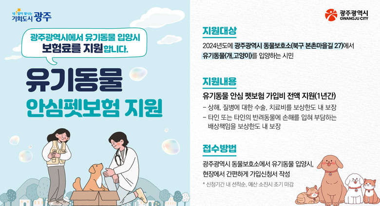 지원 대상은 올해 광주시동물보호소에서 유기동물을 입양하고, 동물등록을 완료한 시민으로, 1년간 유기동물 펫보험에 무료로 가입할 수 있다.
