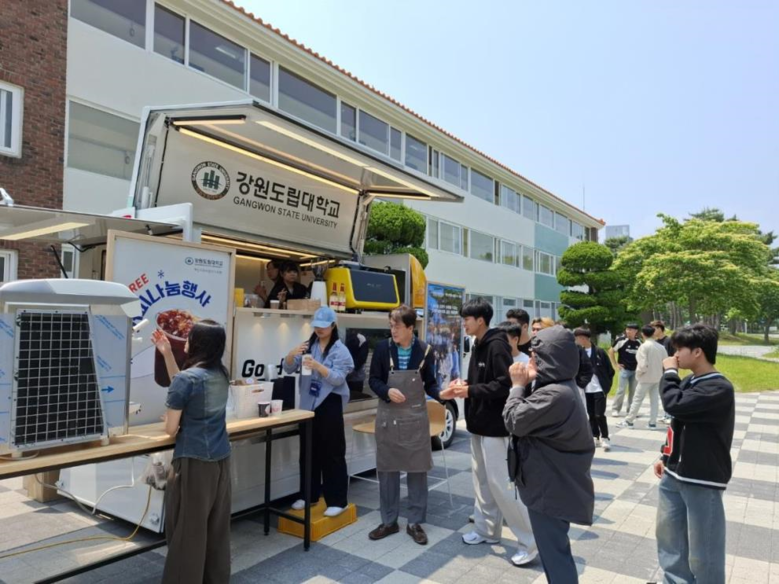 [강원도 세계타임즈=김민석 기자] 강원도립대학교(총장 김광래, 이하 대학)는 혁신지원사업(Ⅱ유형) 융합교육과정에 참여 중인 청년 로컬 크리에이터와 함께 국제교류원 앞 캠퍼스 내에서 신규 제작한 커피트럭의 오픈을 기념하는 ‘커피나눔 소통행사’를 개최했다고 밝혔다.