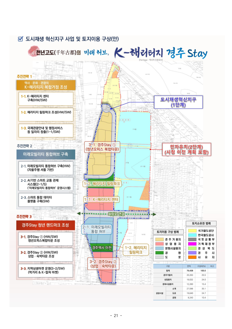 혁신지구 사업은 산업·상업·주거·복지 등의 기능이 집적된 지역거점을 조성하는 사업으로, 1차로 후보지 선정 후 국토교통부 전문가 자문과 컨설팅을 거쳐 세부계획을 수립하여 혁신지구로 최종 선정되며, 경주시 후보지(A=79,438㎡)는 구 경주역(폐역)을 중심으로 역사·문화·관광의 복합거점 조성을 위해 K-헤리티지 센터 힐링파크, 스마트 교통관제 및 통합데이터 플랫폼 구축, 청년오피스, 숙박시설 등의 계획을 수립하여 추진하게 될 계획이다.