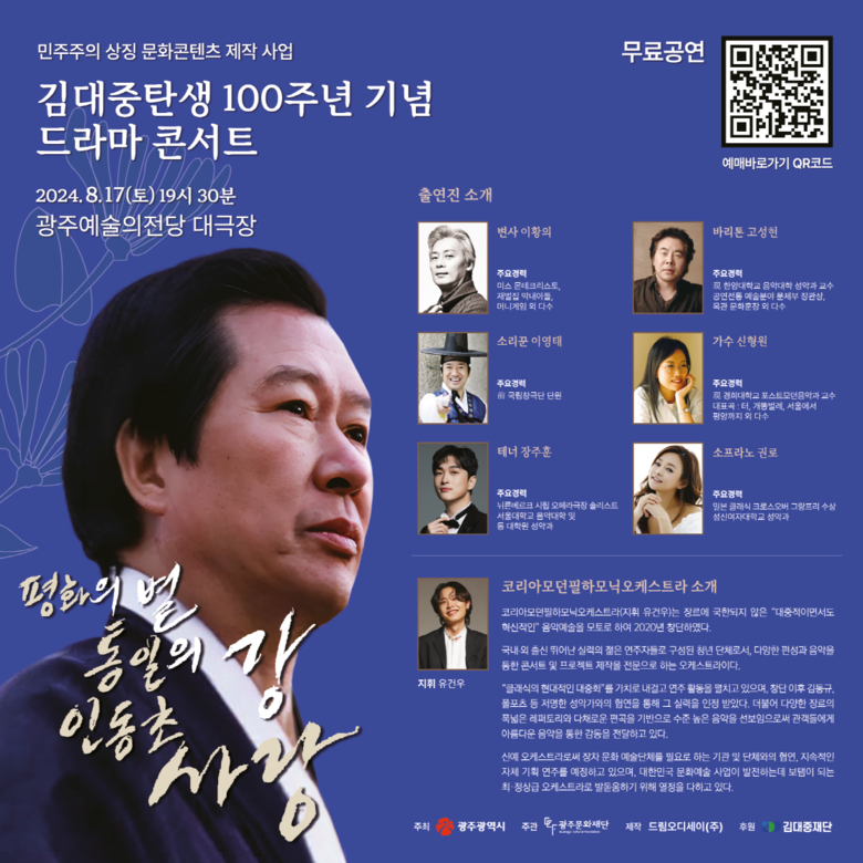 - 추모 전시회·드라마 콘서트 공연 등 문화예술행사 다채 [광주 세계타임즈=손권일 기자] 광주광역시(시장 강기정)는 고 김대중 대통령의 탄생 100주년과 서거 15주기를 기념하는 특별음악회를 오는 17일 오후 5시 전남대학교 민주마루 대강당에서 개최한다.