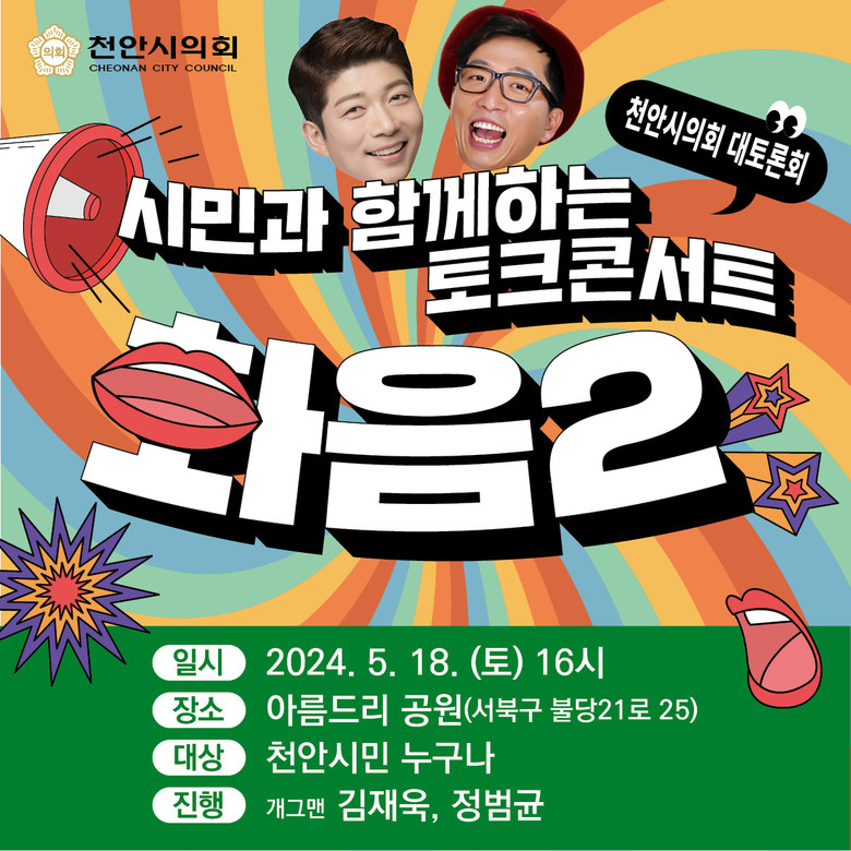 천안시의회는 지난해, 개원 이래 최초로 시민들을 시청으로 초청하여 소통의 장을 마련한 토크콘서트 ‘화음’의 성공에 힘입어 올해는 좀 더 많은 시민을 만날 수 있는 공원으로 장소를 옮긴다.